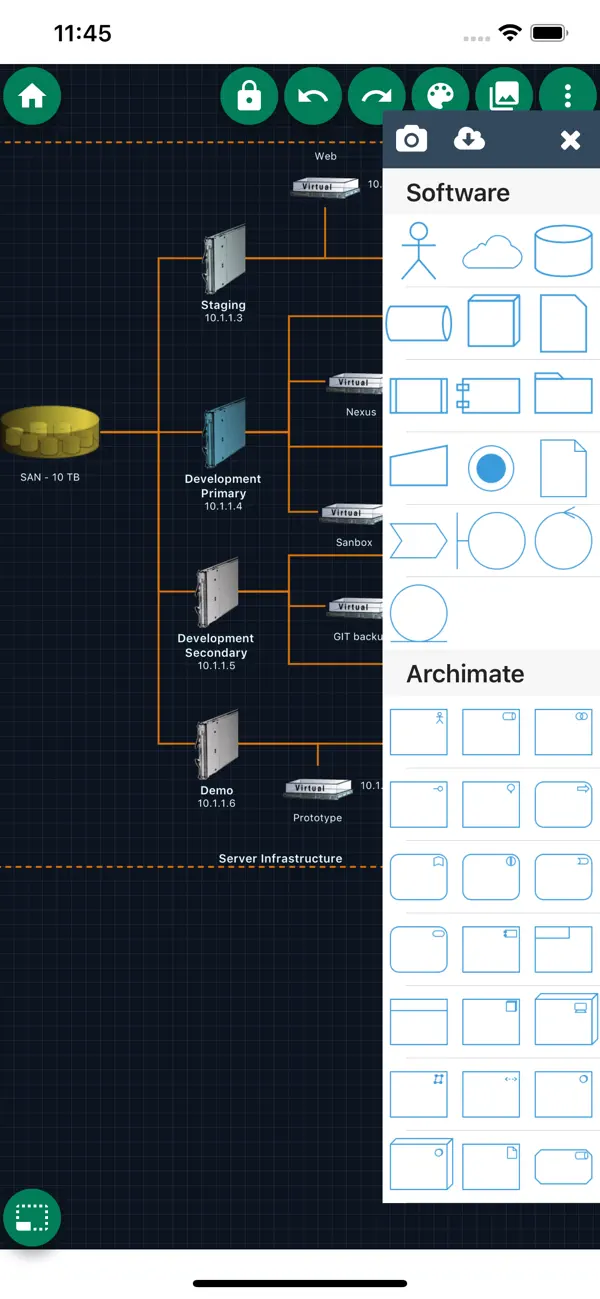 - يتيح دياجرام أيضاً مئات الأشكال والرموز المضمنة لإنشاء أي نوع من الرسوم البيانية.