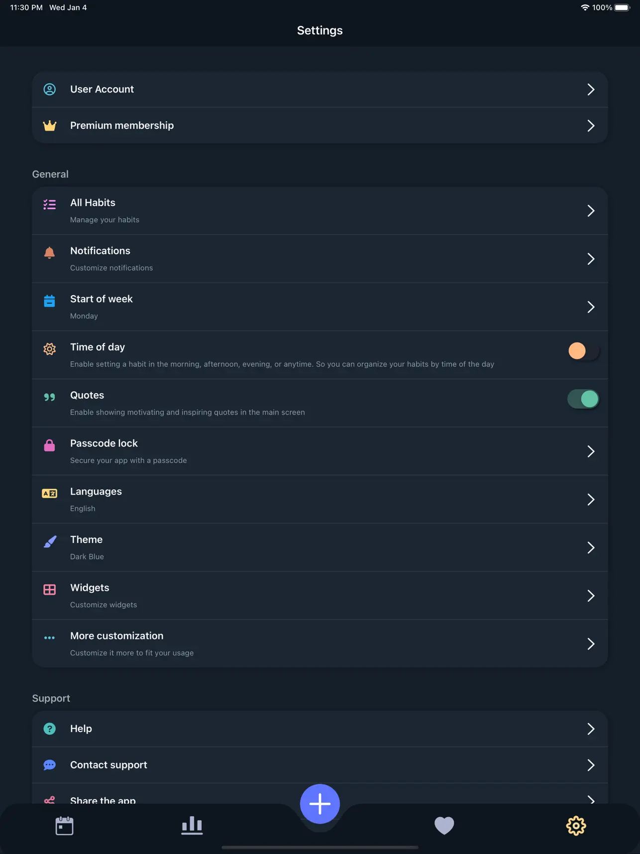 بالإضافة إلى ذلك، يتضمن Habit 360 Premium ميزة تنبيهات التذكير التلقائي، حيث يمكنك ضبط التطبيق لإرسال إشعارات يومية لتذكيرك بتنفيذ العادات الخاصة بك. ويمكنك أيضاً تخصيص التطبيق وفقاً لاحتياجاتك الشخصية من خلال اختيار صورة رمزية وتعيين ألوان مفضلة وتخصيص تنسيقات العرض. تطبيق Habit 360 Premium يتوفر على أجهزة الأيفون والأندرويد، ويمكن تنزيله مجاناً من المتاجر الرسمية. استفد من هذا التطبيق المفيد اليوم وابدأ في تطوير وتعقب العادات الجيدة التي ستساعدك في تحقيق هدفك.
