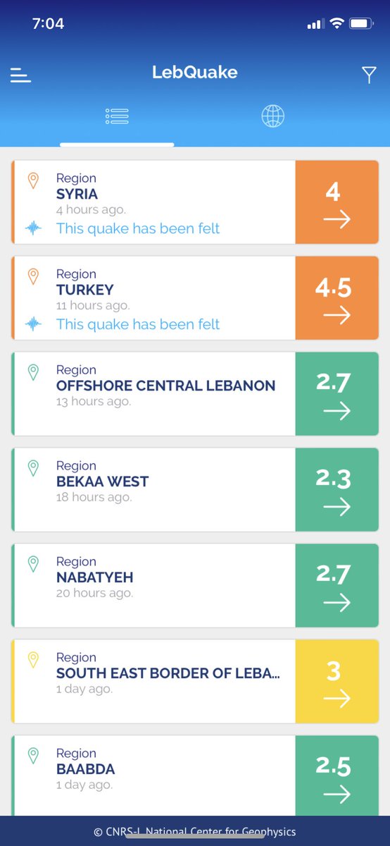 أصبح الان بإمكان اللبنانيين معرفة المعلومات العلمية الدقيقة حول الهزات الأرضية عبر تطبيق lebquake الذي أطلقه المركز الوطني للجيوفيزياء التابع للمجلس الوطني. وقد جاء اطلاق تطبيق رصد الزلازل للايفون lebquake مواكبة منه للتطورات التكنولوجية وللحد من الأخبار الكاذبة المتناقلة بشأن الهزات والزلازل الأرضية والتي تثير الذعر لدى الكثيرين.