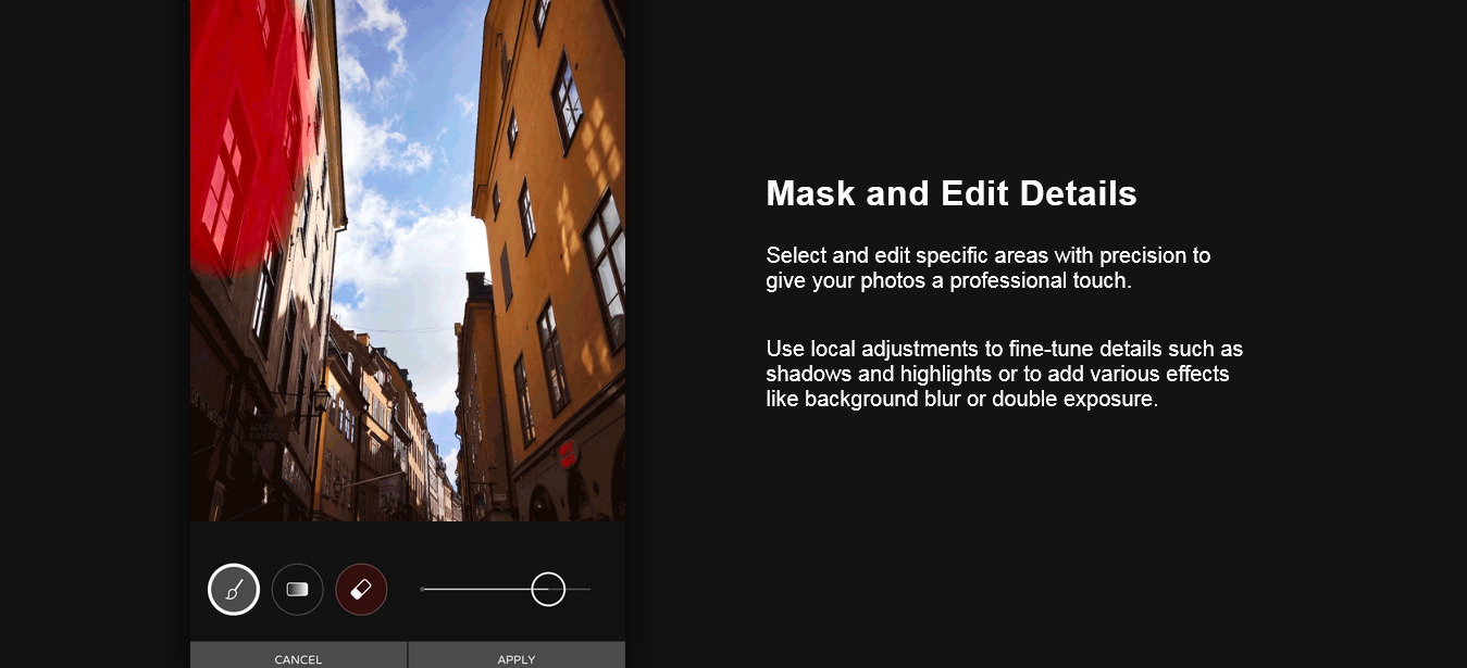- يضم هذا التطبيق العديد من الأدوات للتعديل على الصور بطريقة احترافية مميزة، مثل الفلاتر وامكانية التحكم بالسطوع وتصحيح الألوان وتعديل الظلال وإضافة بعض الضبابية على الصور وزيادة تباينها ووضوحها.